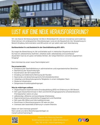 Sende uns deine Bewerbungsunterlagen jetzt an: margrit.soliva@haenerag.ch